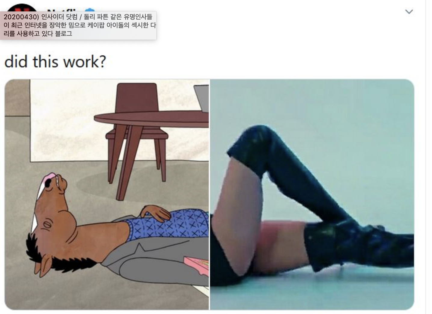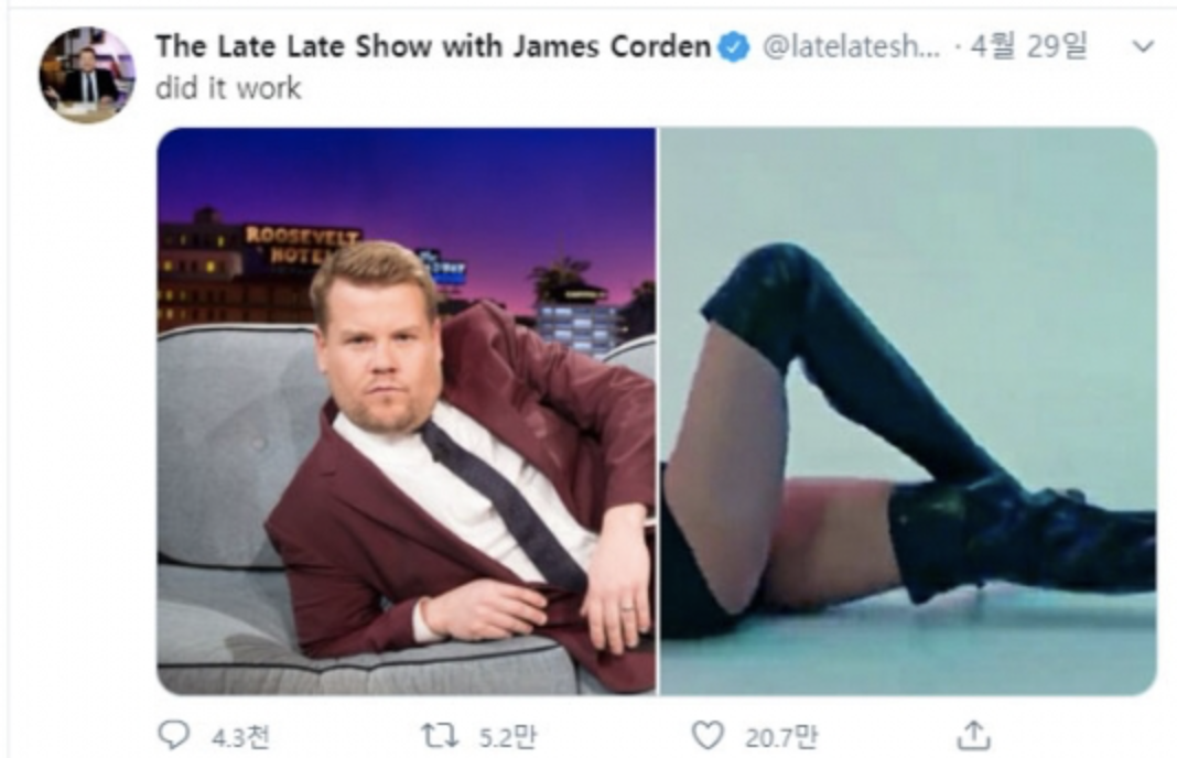 코로나때문에 사람들이 어지간히 심심하기도 한가보다ㅋㅋㅋㅋ미국 유명한 토크쇼 제임스 코든도 동참했다. 그래도 이 짤 중에서 가장 절묘한 건 로다주네ㅋㅋㅋㅋㅋ 여튼, 리사 다리가 워낙 길고 예뻐서 댄스 영상을 올려도 사람들이 그냥 못지나치나봐.