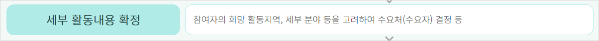 5단계는 세부 활동내용 확정으로 참여자의 희망 활동지역과 세부 분야 등을 고려하여 수요처를 결정하는 단계입니다.