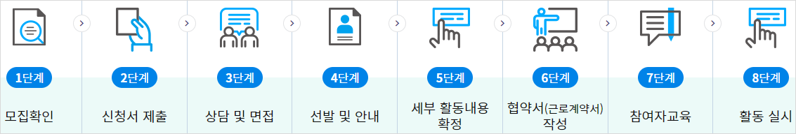 3단계는 상담 및 면접으로 신청자 희망활동과 사업적합성, 활동역량 등을 면담을 통해서 확인하는 단계입니다.