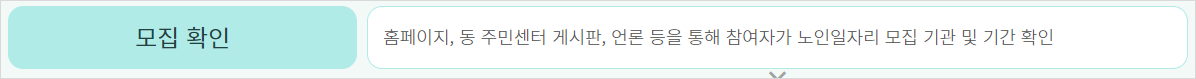 1단계는 모집확인 단계로써 홈페이지, 동 주민센터 게시판, 언록 등을 통해 참여자가 노인일자리 모집 기관 및 기간을 확인하는 단계입니다.