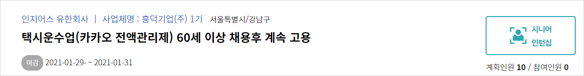 최근에는 인지어스 유한회사에서 서애운수 1기를 모집하였으며, 서울시 서초구를 근무지역으로 직무내용은 마을 버스 운행이며, 시니어인턴십 3개월 운영 후 계속 고용 유지, 모집연령대는 60대, 급여조건은 회사 내규에 한하여 4대보험과 정규직전환, 경조사 등의 혜택이 주어집니다.