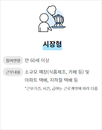 시장형의 경우 만 60세 이상 소규모 매장 및 아파트 택배, 지하철 택배 등의 근무활동을 합니다.