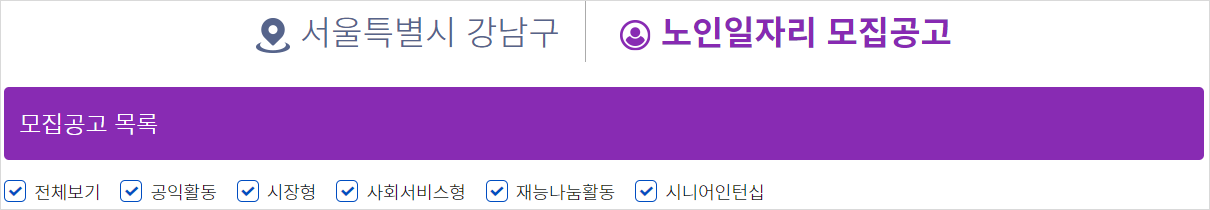 예를 들어 서울특별시 강남구를 검색하면 다음과 같이 현재 모집하고 있는 일자리들과 마감한 일자리들을 확인할 수 있습니다.
