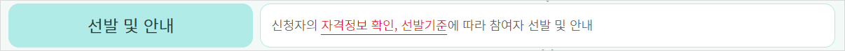 4단계는 선발 및 안내로 신청자의 자격정보를 확인하여 선발기준에 따라 참여자 선발 및 안내를 하는 단계입니다.