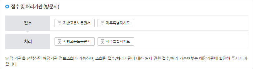 고용유지지원금 접수 및 처리기관에 방문 신청할 경우 지방고용노동관서를 통해서 접수 및 처리를 진행할 수 있으며, 각 기관을 선택하면 해당기관 정보조회가 가능합니다. 조회된 접수 및 처리기관에 대한 실제 민원 접수 및 처리 가능여부는 해당기관에서 확인할 수 있습니다.