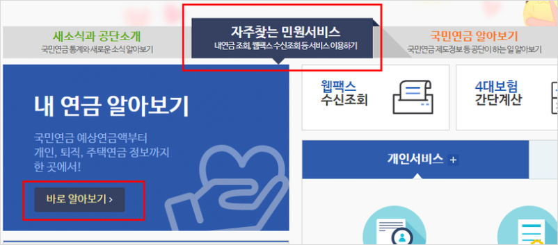 국민연금공단 홈페이지에 접속한 다음 메인 화면에 나오는 중앙에 있는 자주찾는 민원 서비스를 클릭합니다. 그럼 내 연금 알아보기라는 메뉴를 확인할 수 있습니다. 이를 통해 국민연금 예상금액과 개인, 퇴직, 주택연금 정보등을 한눈에 알아볼 수 있습니다.
