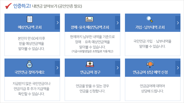 앞서 설명하였듯이 본인인증절차를 진행한 다음 예상 연금을 알아보는 방법과 인증없이 간단하게 국민연금 수령액 알아보기를 진행할 수 있는 2가지의 방법이 있습니다.