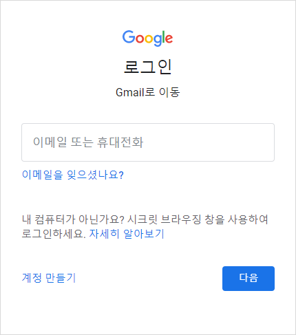 앞서 설명하였듯이 지메일은 구글에서 운영하고 있는 메일 프로그램으로 구글에 속해있기 때문에 구글 아이디를 가지고 있어야 지메일 로그인도 진행할 수 있습니다.