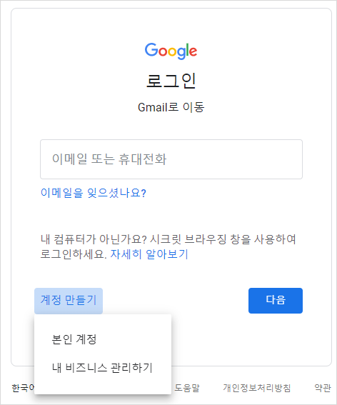 좌측 하단에 있는 계정만들기를 선택하여 회원가입을 진행해줍니다. 본인계정 혹은 비즈니스 계정 만들기가 나오는데 그중에서 어느 것을 선택하여도 회원가입을 할 수 있습니다. 참고로 비즈니스 계정을 사용하면 구글 서비스를 이용하는데 제약이 있을 수 있으니 본인 계정을 만드는 것을 추천드립니다.
