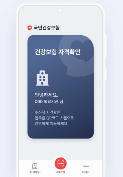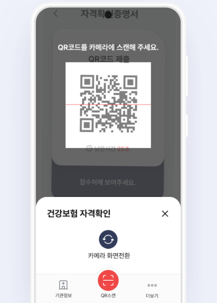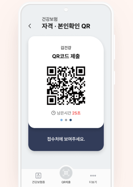 접수창구에서 스마트폰으로 건강보험증 화면을 보여주면, 병원 직원이 QR코드나 바코드를 스캔하여 자격을 확인하게 됩니다.