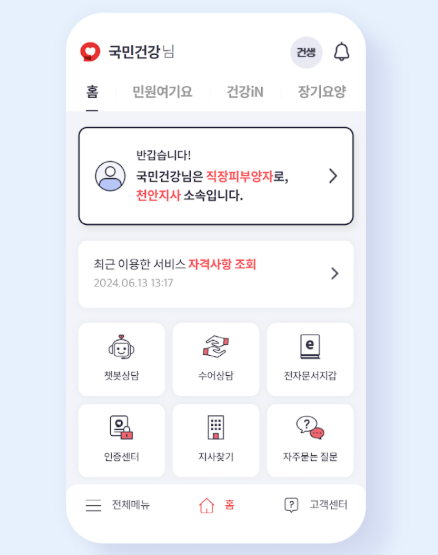 본인의 건강보험 가입 내역, 피부양자 등록 여부, 보험료 납부 상태 등을 앱에서 바로 확인할 수 있습니다.