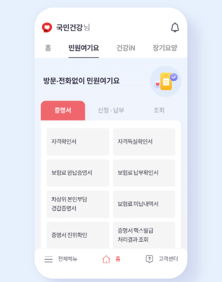건강보험 자격득실 확인서, 보험료 납부확인서 등 각종 증명서를 모바일로 신청하고 PDF 파일로 저장하거나 제출할 수 있습니다.