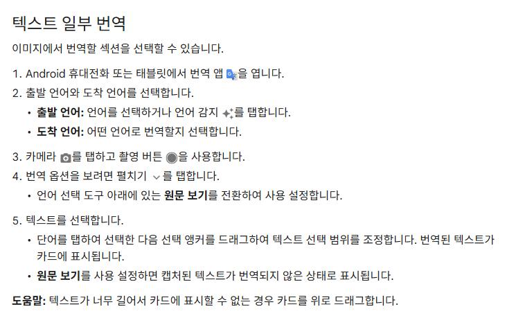 - 조명 중요: 사진 품질이 좋을수록 번역 정확도도 올라갑니다. 그림자 피해서 촬영하세요.