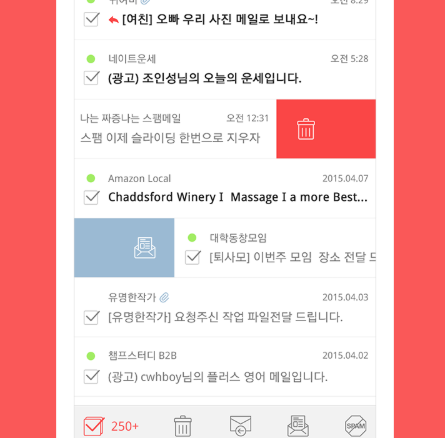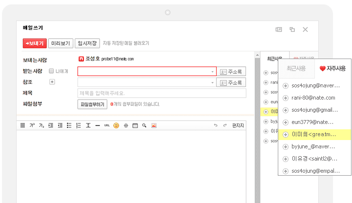 쉽고 빠른 편집 메일 선택 후 내 메일함으로 끌어당겨 보세요. 손쉽게 이동 및 삭제를 할 수 있습니다. 스마트한 우측 뷰 쓰기에서 자주 사용하는 메일주소를 저장할 수 있으며 편지함에서는 분